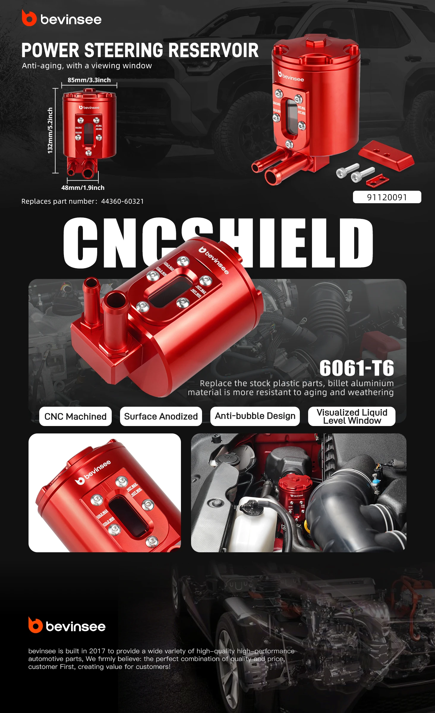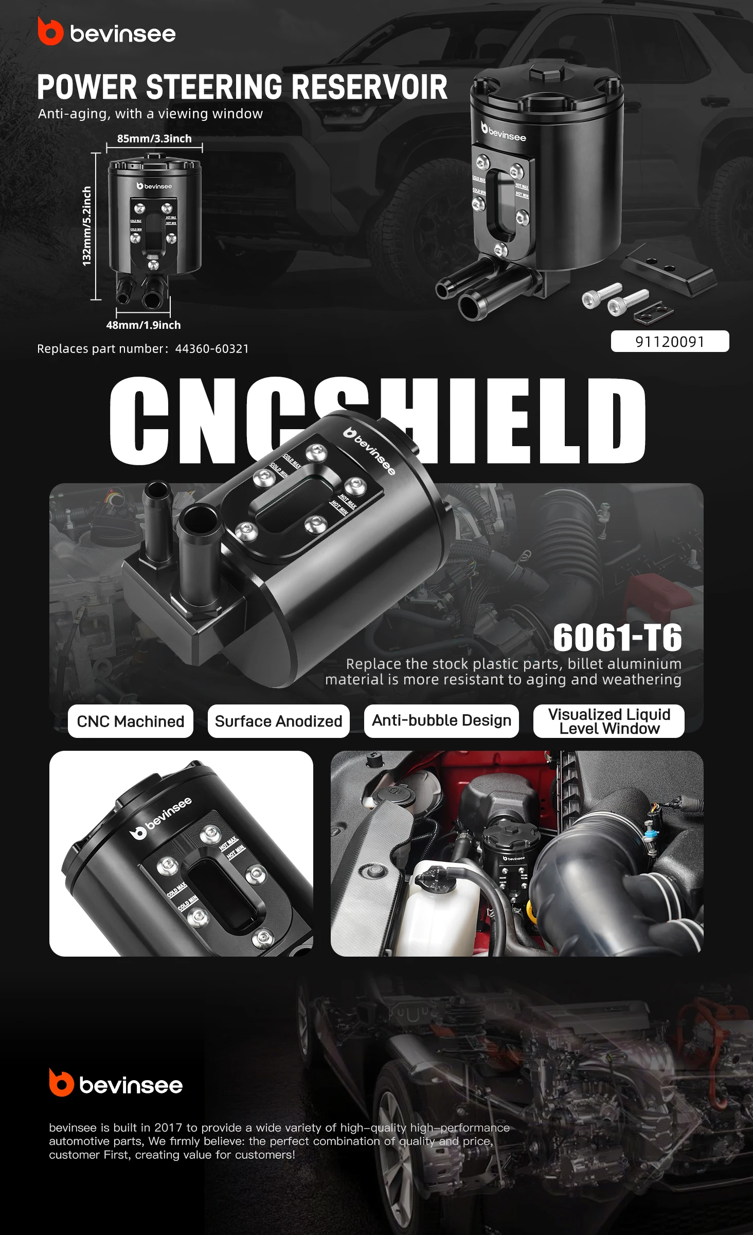 This upgraded aluminium reservoir solves all three problems at once. It replaces the aging plastic with strong billet aluminium, adds a built-in baffle to cut down on bubbles, and includes a clear viewing window so you can check fluid levels instantly without opening anything.