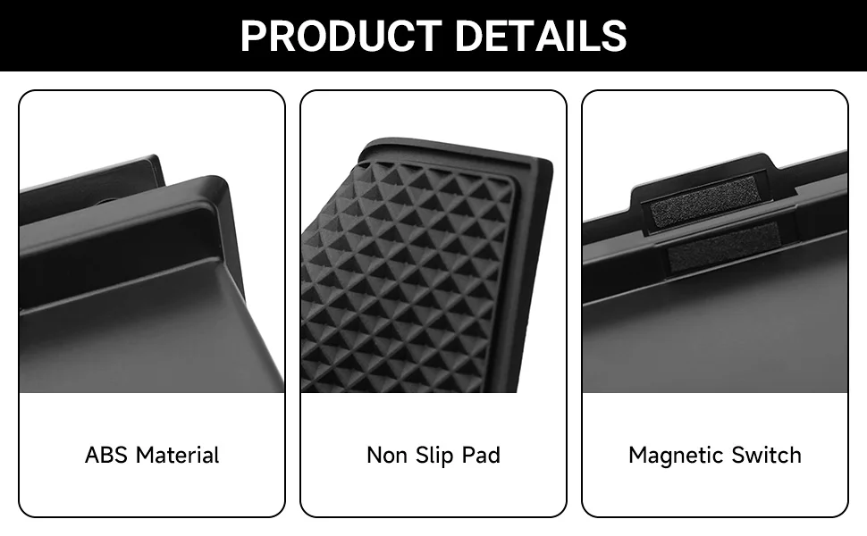 The box is made from strong ABS plastic for durability, and anti-slip pads on both sides help cut down on rattling or noise while you drive. Installation takes only a few seconds. Just slide it into position with no tools, no trimming, and no adjustments needed.