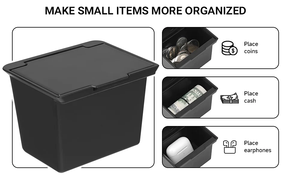 It gives you a simple spot to store everyday items like coins, AirPods, small accessories, rings, or other loose pieces that normally roll around the cabin. Keeping these small items in one organized space makes the interior cleaner and helps you grab what you need quickly.