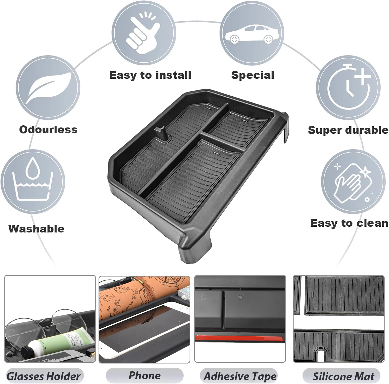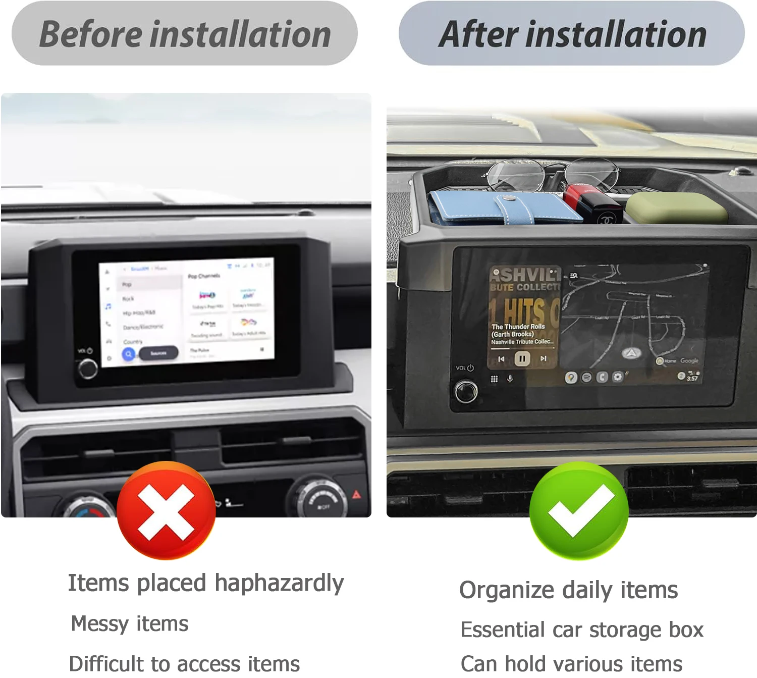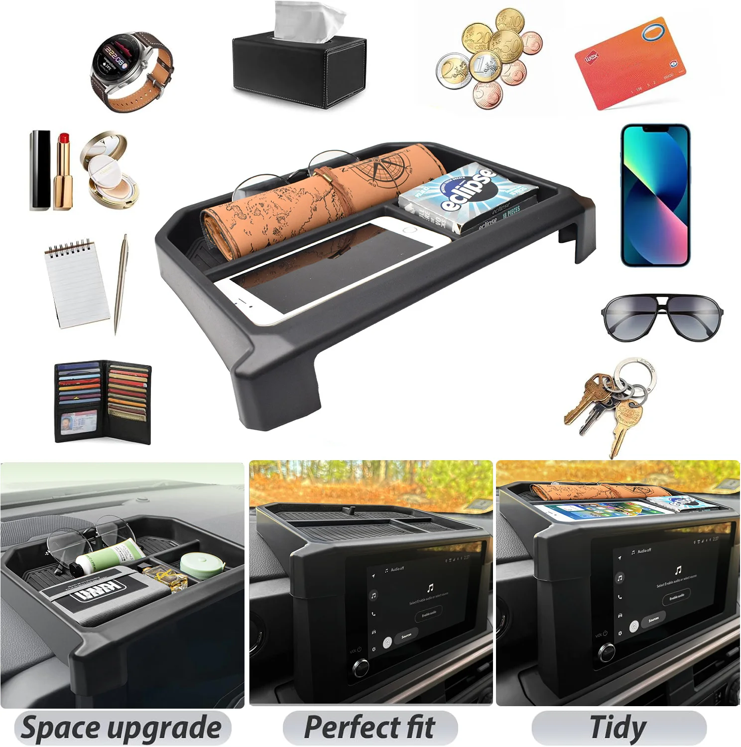 Installation takes seconds—no screws, no drilling, no modifications. Just drop it in, and it’s ready to go. From coins and USB drives to your wallet, lighter, or phone, everything stays organized and right where you need it.