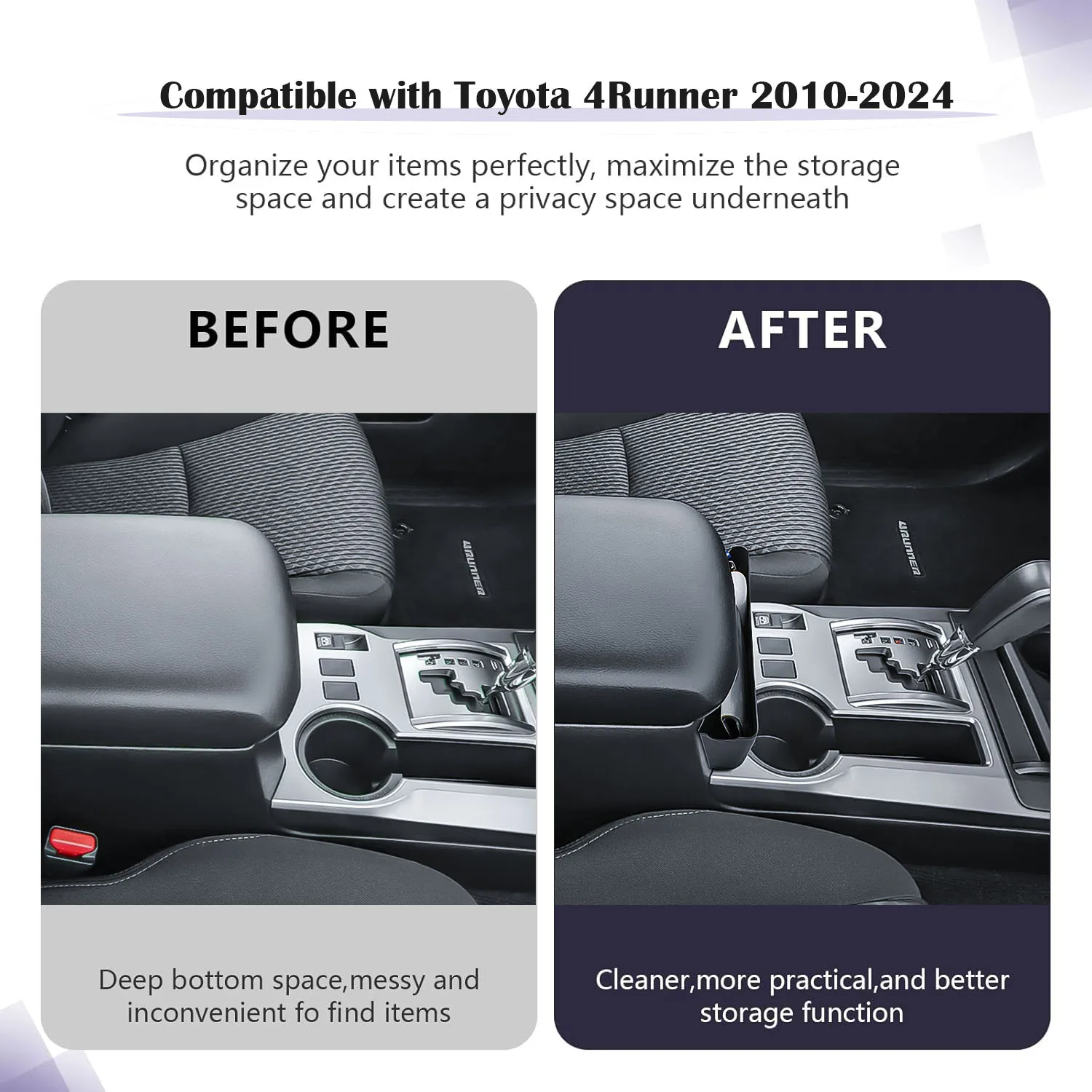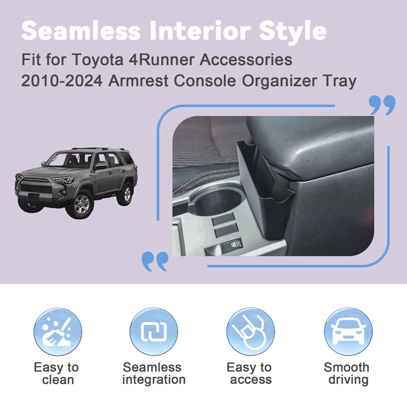 Designed specifically for Toyota 4Runner models from 2010 to 2024, the tray hangs neatly on the center console armrest and fits like a factory piece. It stays out of the way and doesn’t interfere with armrest use, seat movement, or driving comfort.