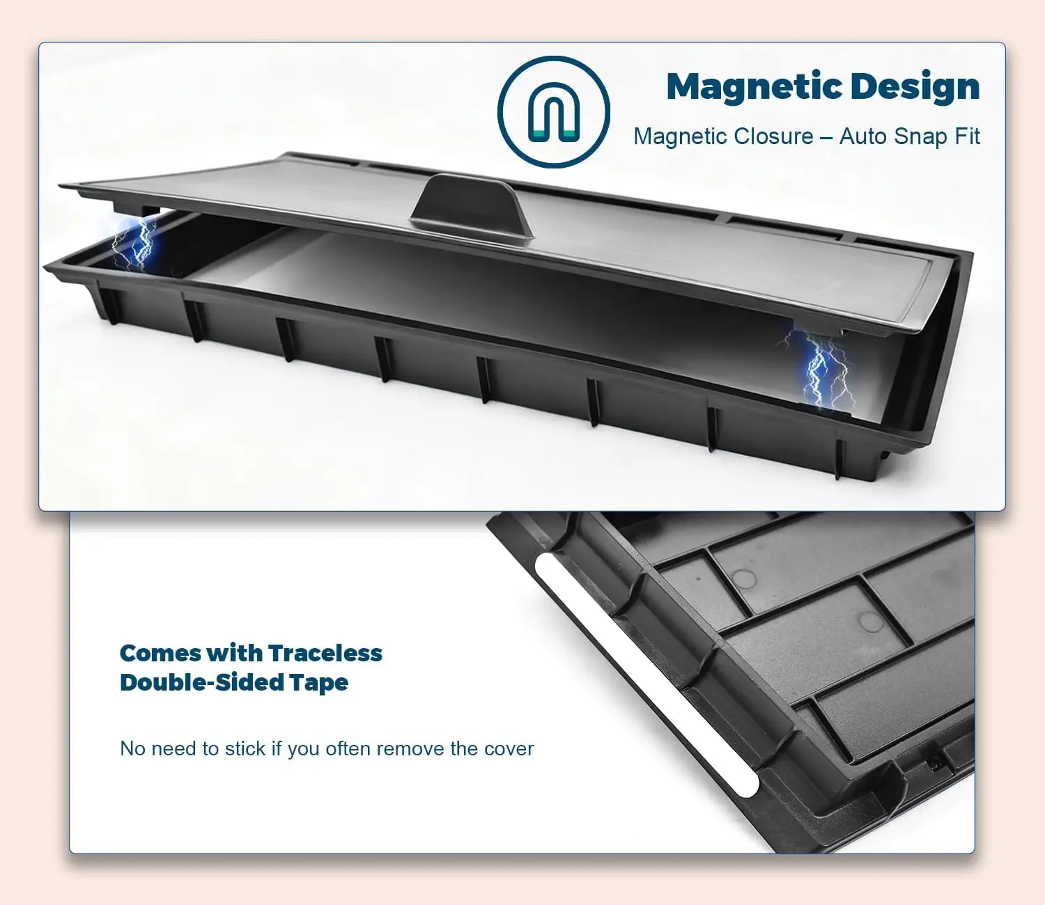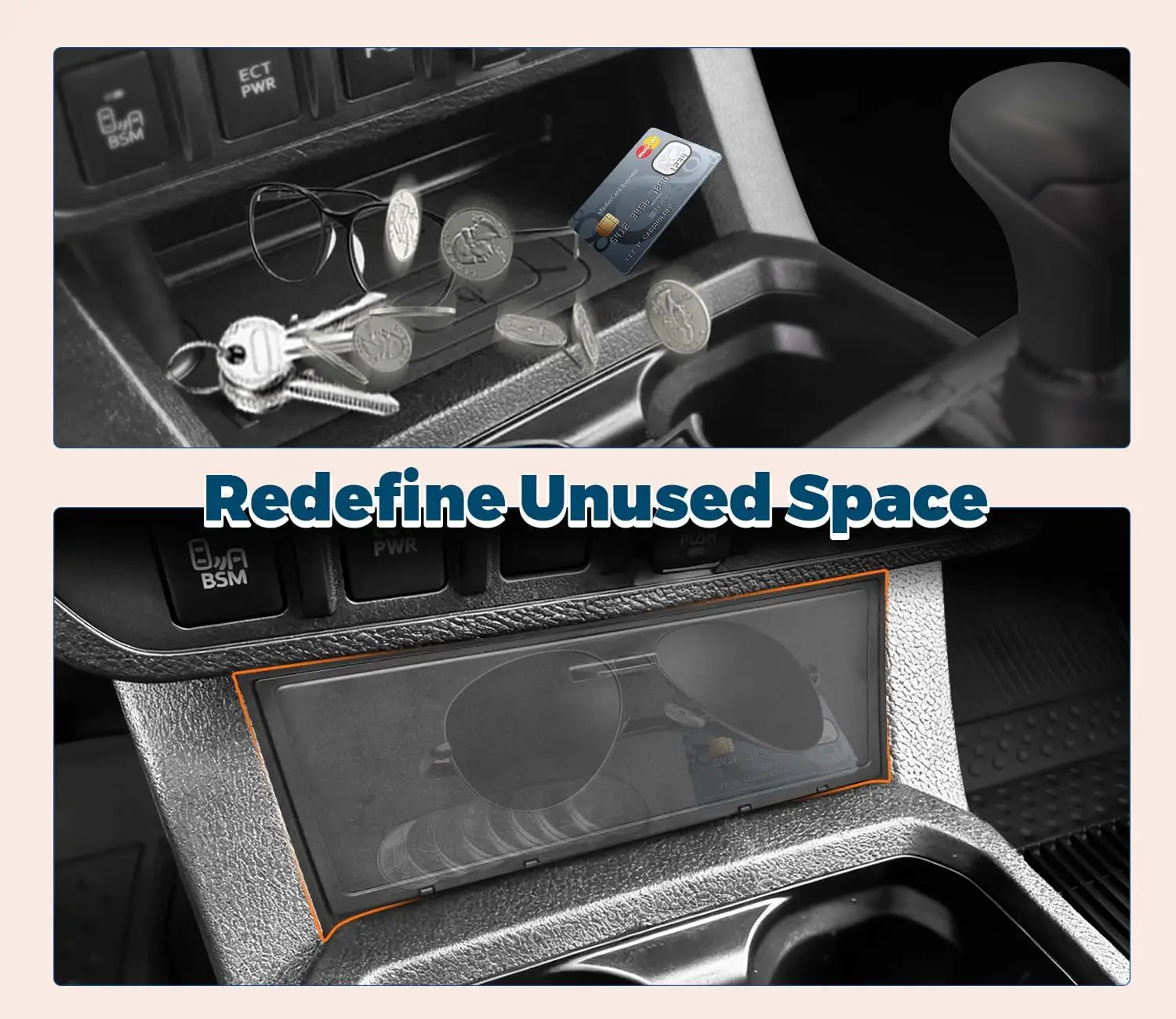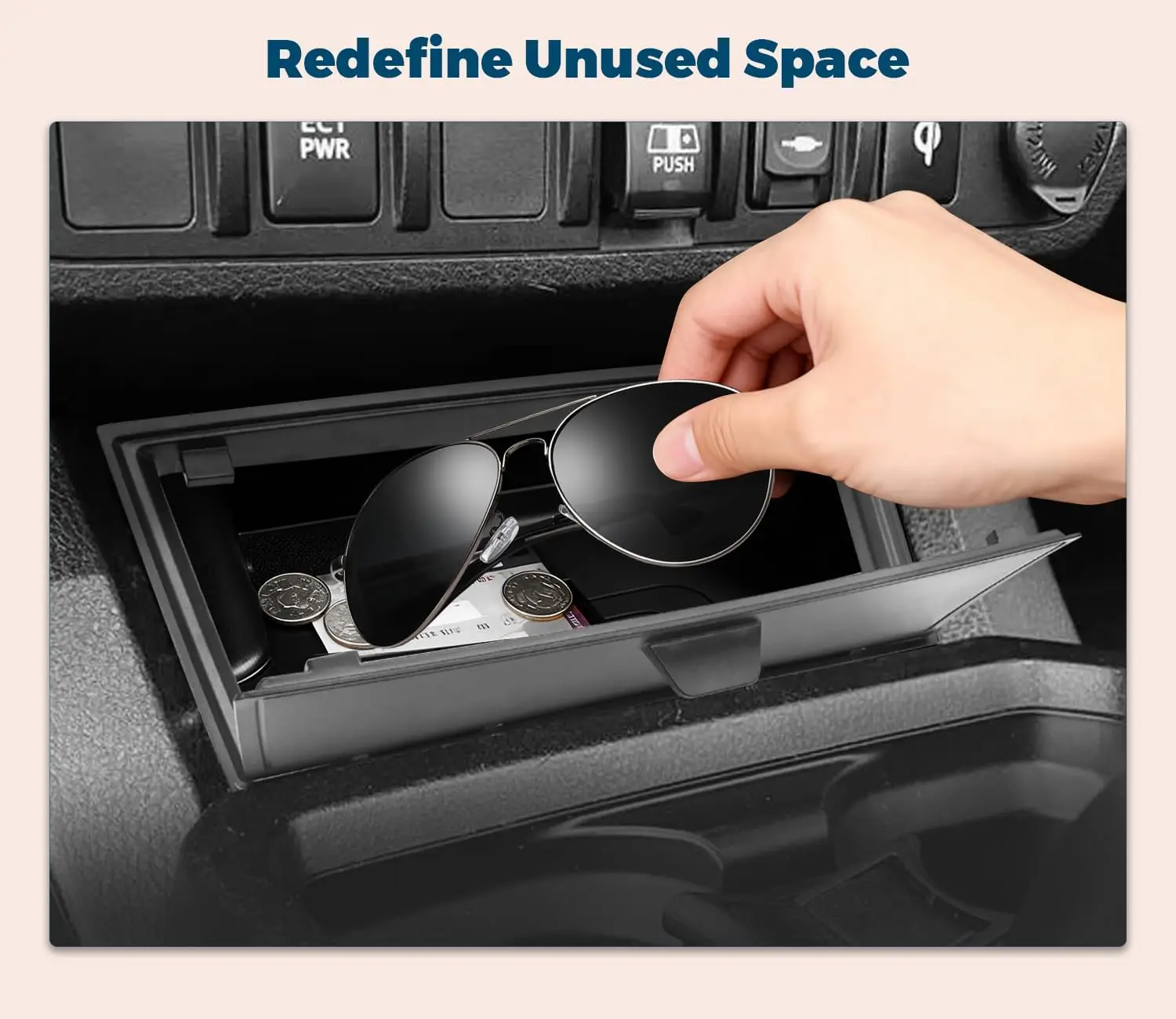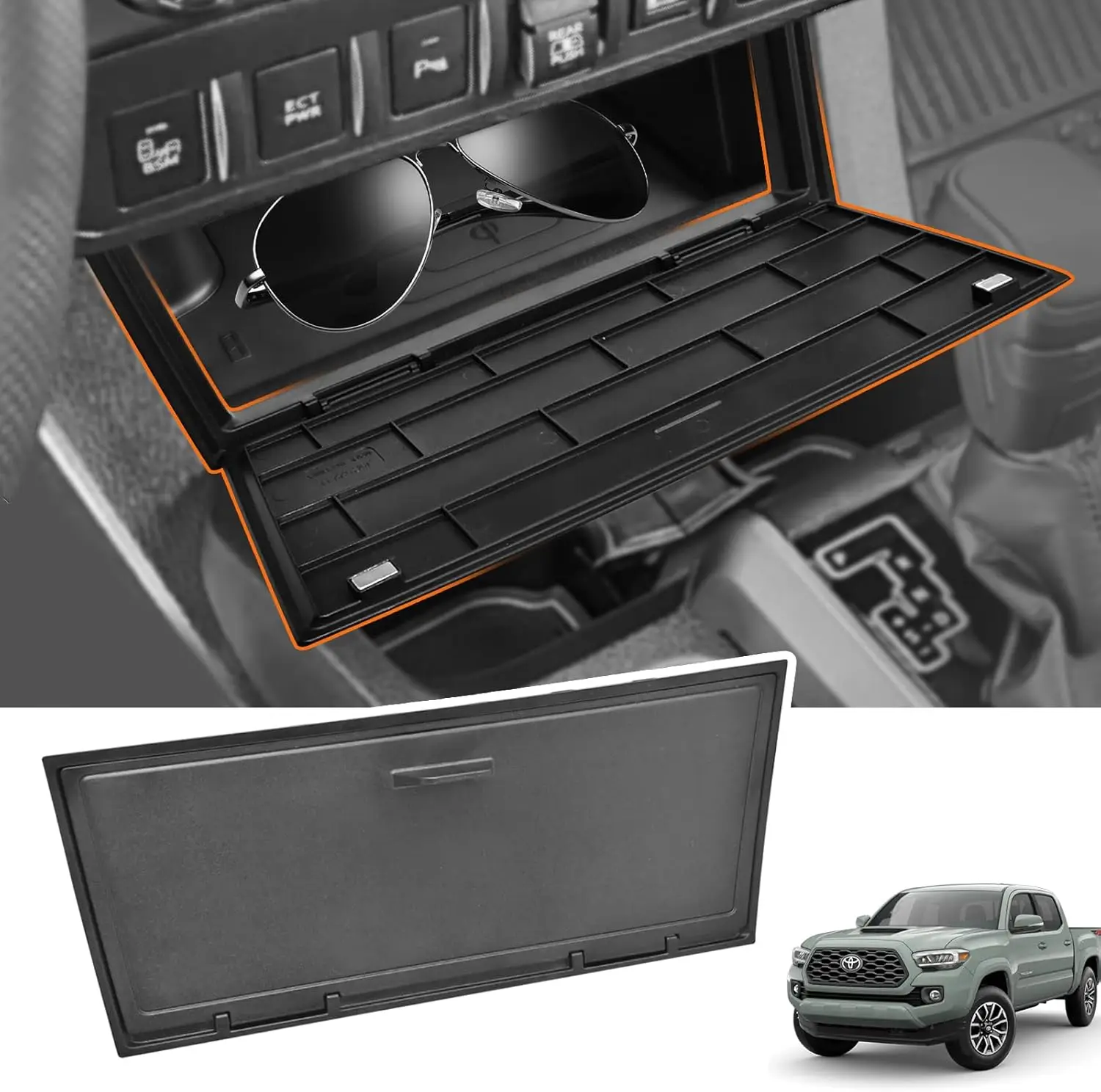 The front center console in the Toyota Tacoma has unused space that often goes overlooked. Small items like sunglasses, cards, or keys can end up loose, visible, or sliding around while driving. This hidden console storage cover turns that empty space into a clean, functional compartment.