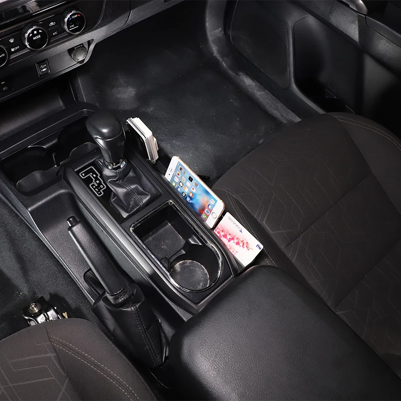 Designed specifically for Toyota Tacoma models from 2016 to 2023, the tray fits neatly along the center console next to the gear shift. It blends in with the interior and looks like it came from the factory, not an add-on.
